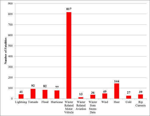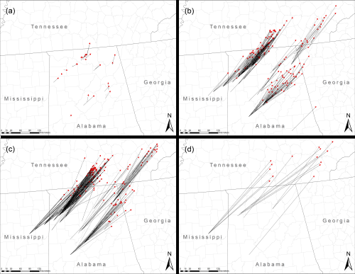 | Below: Research illustrating the average number of fatalities per year from various meteorological hazards for the period 1996–2011, highlighting the number of fatalities resulting from winter precipitation related motor vehicle crashes (left) and tracks of debris objects that traveled a) < 50 km; b) 50 to 150 km; c) 150 to 250 km; d) >250km from the 27 April 2011 Tornado Outbreak as derived from social media data (right) | ||